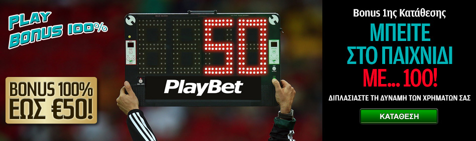 - H προσφορά προβλέπει πίστωση ποσού bonus το οποίο θα είναι ίσο με το 100% της πρώτης κατάθεσης που θα πραγματοποιηθεί στο αθλητικό στοίχημα της Playbet.